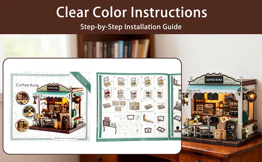 - Easy to Assemble:This miniature coffee shop kit is beginner-friendly, perfect for first-time crafters. It comes with pre-cut wooden pieces, wires, a battery case (2-AAA batteries not included), and detailed color instructions. Just follow the simple steps, and you’ll have it assembled in no time. (Note: Glue is not included.)